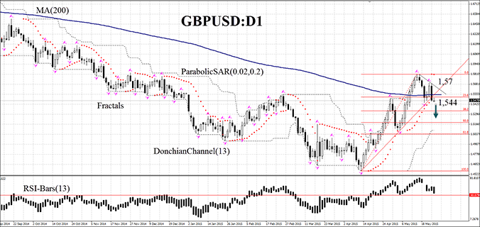 Hoy nosotros queremos volver otra vez al gráfico de lalibra esterlina GBPUSD que nosotros ya consideramos la semana pasada. Como se esperaba, éste se ha corregido hacia abajo después de crecimiento de dos meses. Nosotros no excluimos que el movimiento descendiente pueda continuarse. En primer lugar, eso está relacionado con el fortalecimiento del dólar estadounidense después del crecimiento de la inflación base del abril en 0,3% que se considera como máximo desde el enero de 2013. En marzo este indicador también se ha aumentado pero sólo en 0,2%. El viernes la presidenta de Fed, Janet Yellen declaró sobre la disposición de su departamento de subir las tasas durante el año corriente. En el fondo de esta caída del viernes GBPUSD resultó el máximo durante tres semanas. Los inversores no prestaron mucha atención en la información positiva de que el déficit del presupuesto estatal de Gran Bretaña debido a nuevas deudas, fue notablemente menos de lo que se esperaba. En comparación con el abril del año pasado éste se ha reducido en 27%. Según nosotros, tal desprecio del positivo macroeconómico puede comprobar que los participantes del mercado cuentan con la continuación de la corrección. Una información más importante será publicada el jueves sobre el PIB de Gran Bretaña de la primera sección. El pronóstico preliminar es positivo que limita el potencial de la debilitación de la libra esterlina.